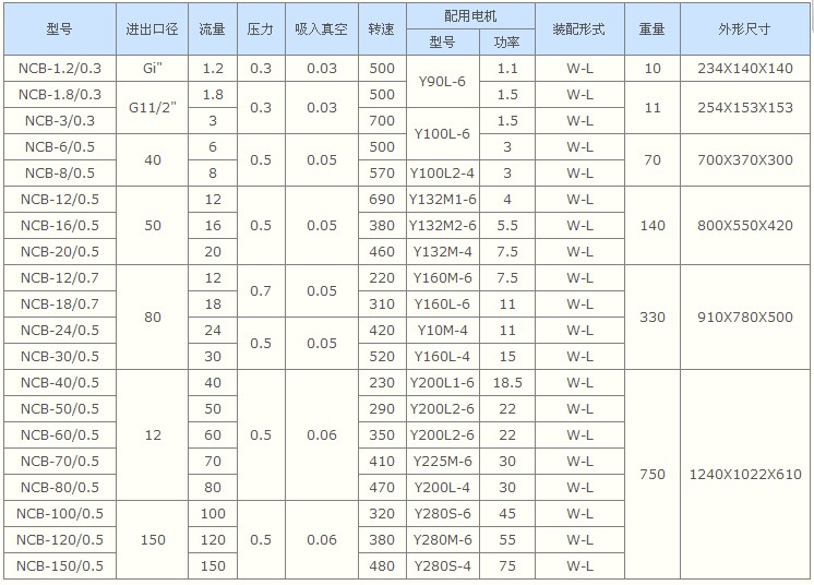 NCB型內(nèi)嚙合高粘度齒輪泵性能參數(shù)表: